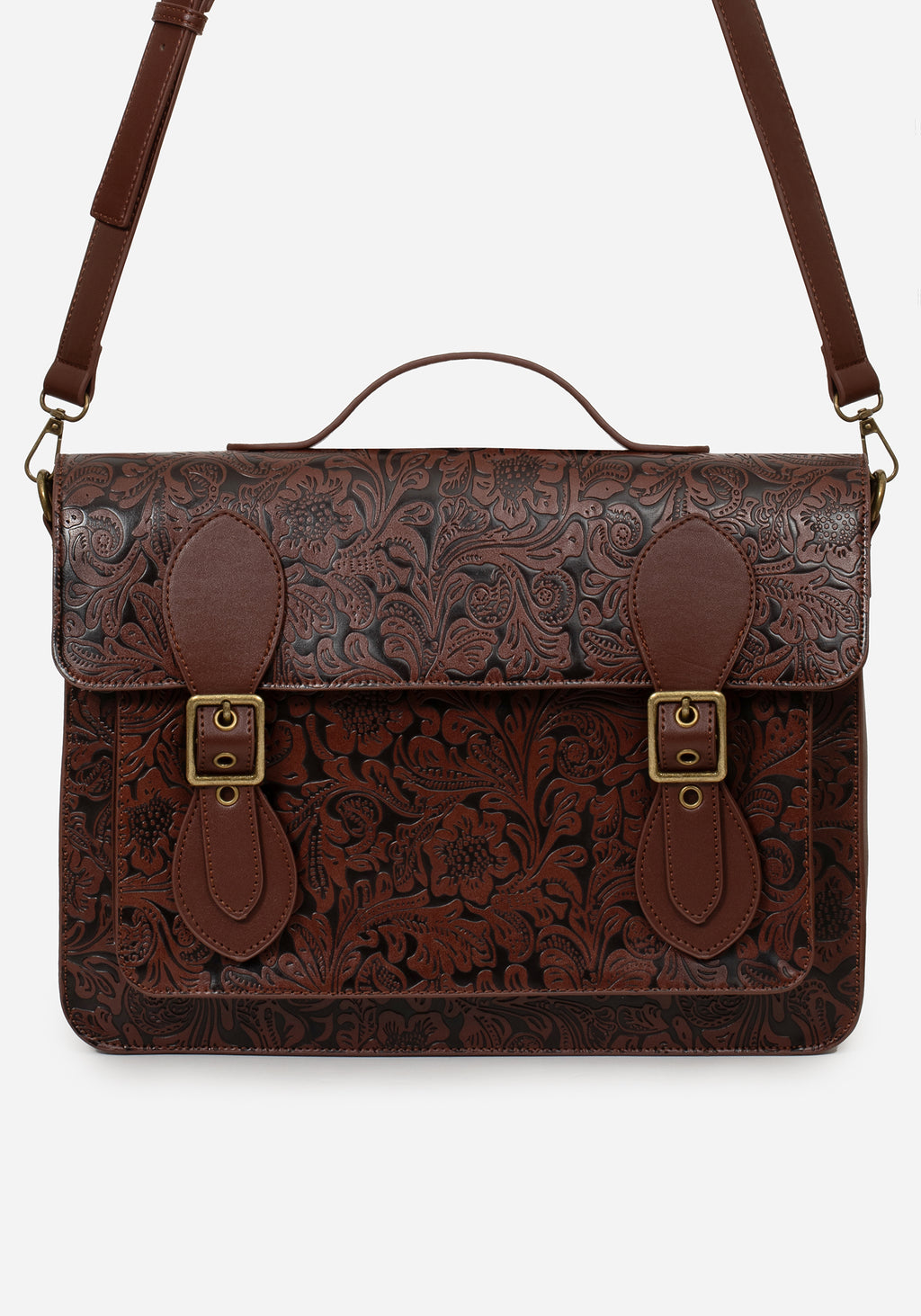 • Brown PU Leather Floral Debossed Crossbody Satchel Bag