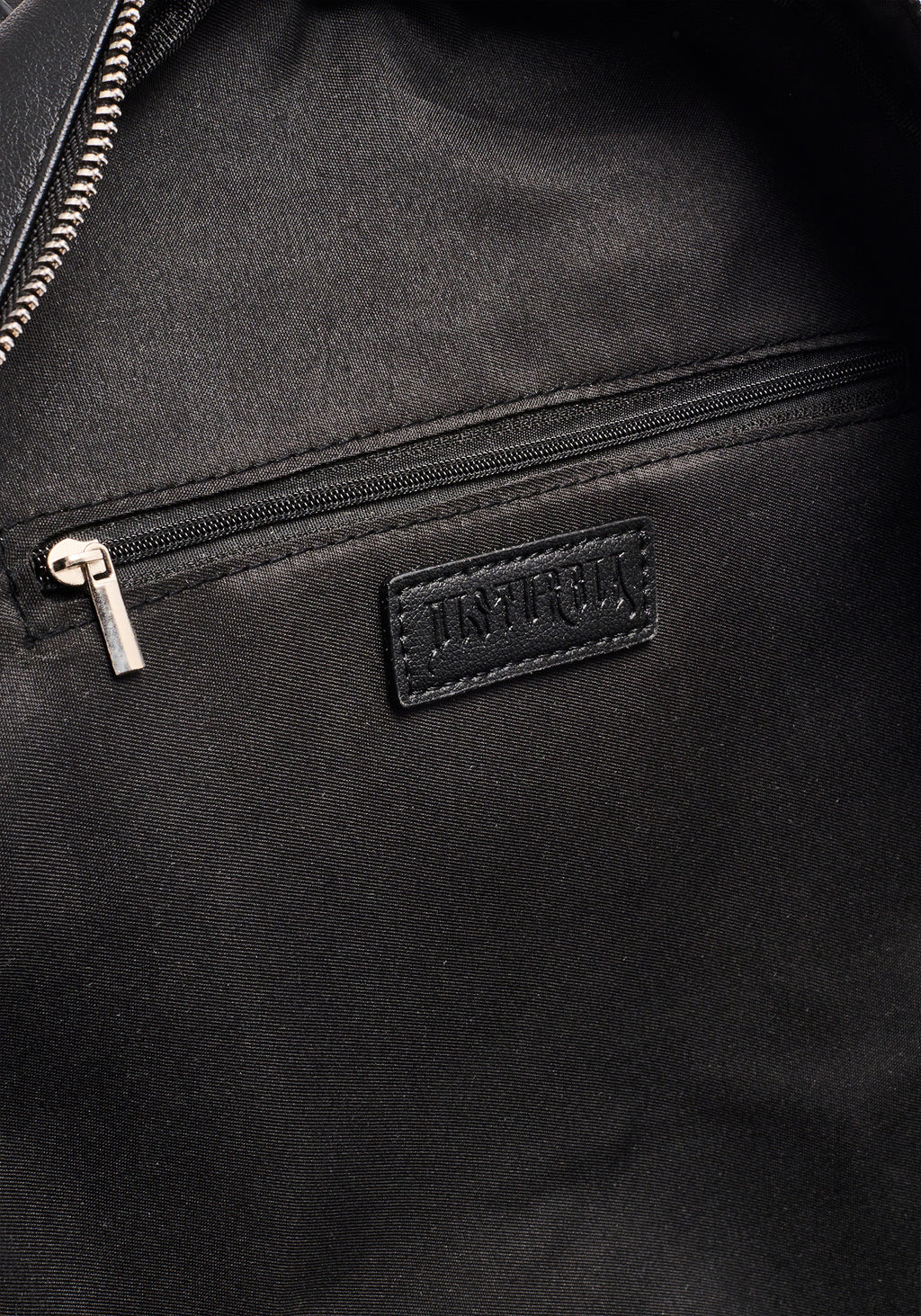 - Smooth silver zipper closure with self-fabric tab