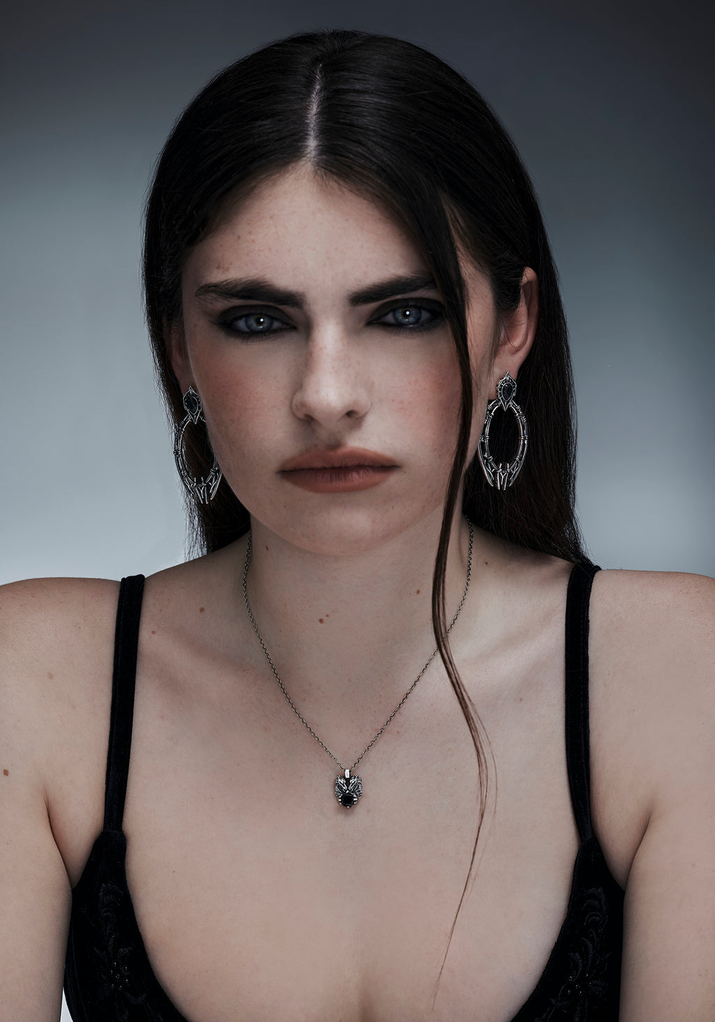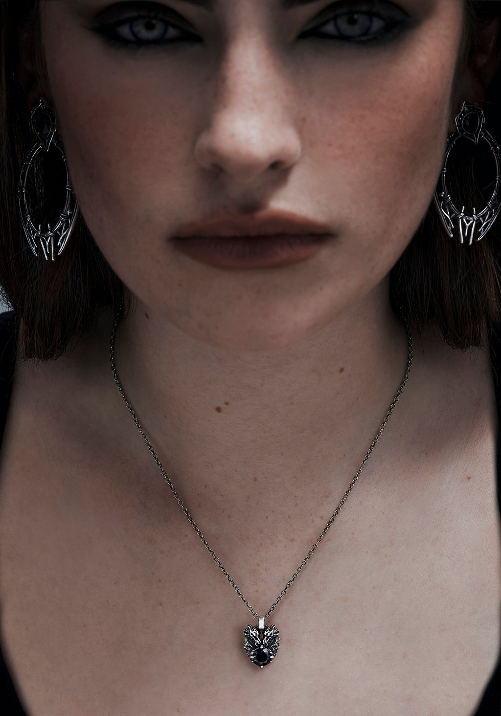 Whispered vows beneath the dragon's shadow… the Forevermore collection unveils a sterling silver necklace that merges gothic elegance with mythical allure. Featuring a large black spinel centre stone flanked by intricately crafted dragon details, this pendant embodies devotion, strength, and timeless romance.