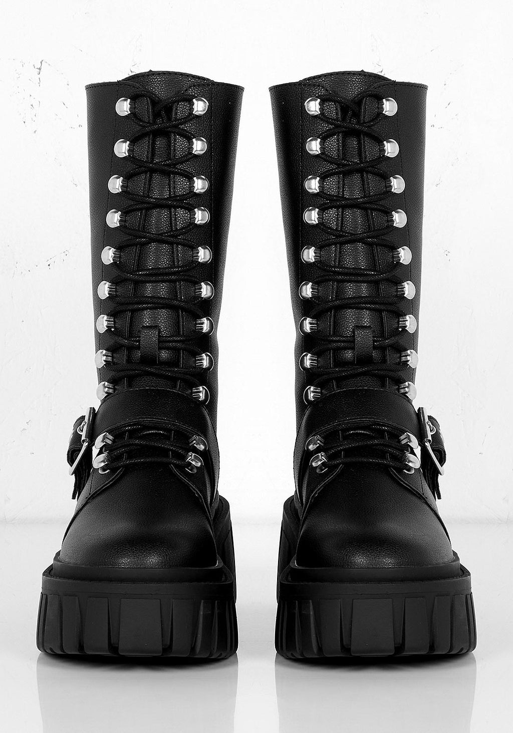 Premium faux leather, mid calf, lace up boot with statement sole.