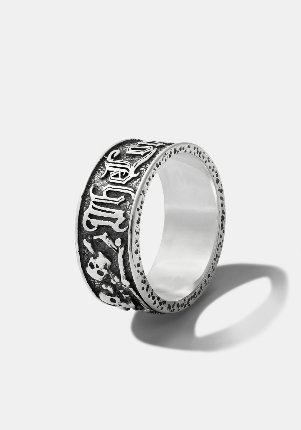 Where destiny draws two souls together… this gothic engagement band showcases The Lovers tarot alongside skulls, scattered bones, and symbolic detailing that reflects devotion and enduring connection.