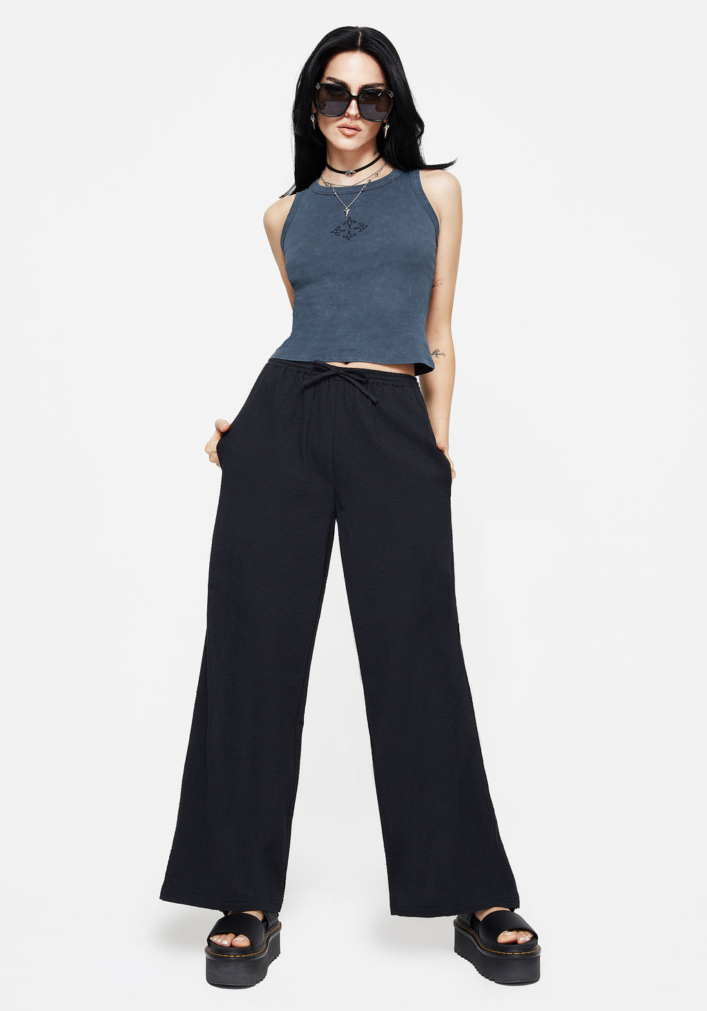 • Black Seersucker Straight Leg Trousers