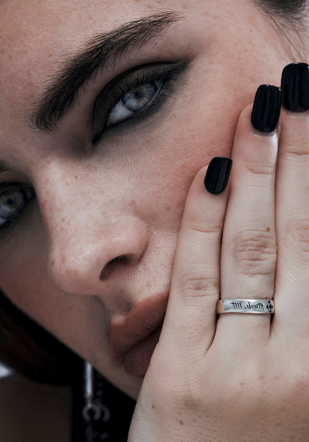 • Sterling Silver Ring with ‘Till Death’ Engraving & Black Spinel Stones