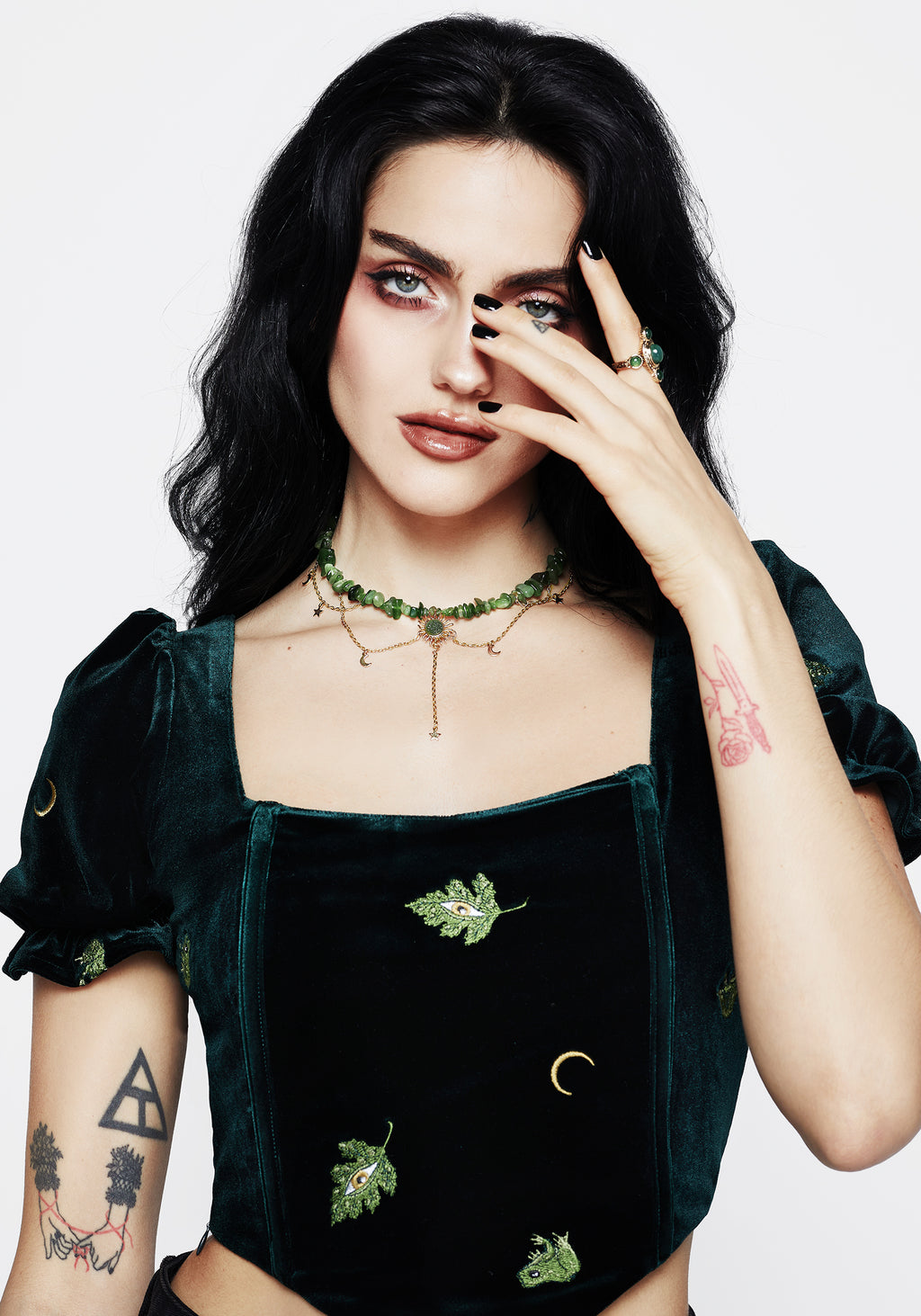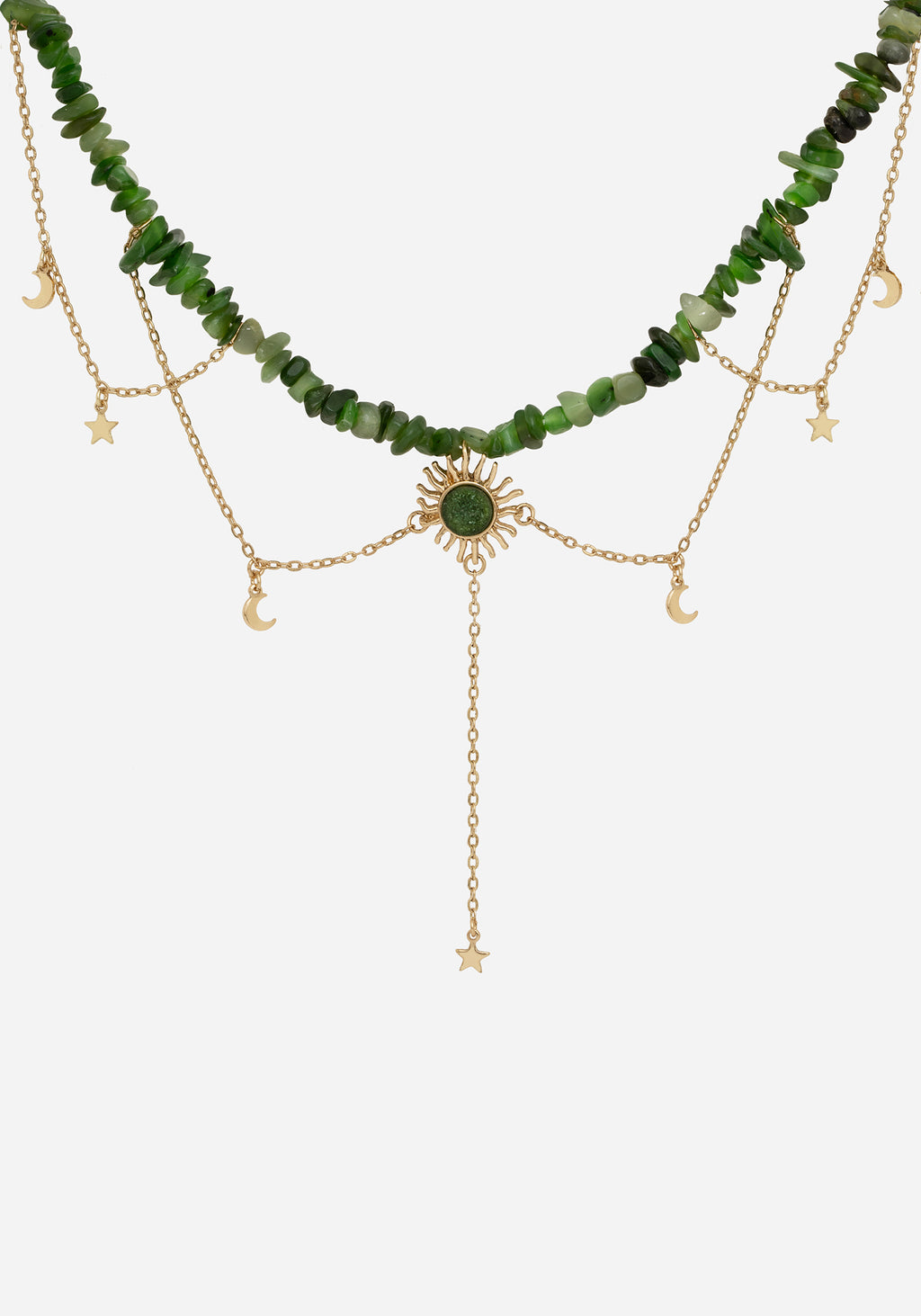 An ethereal, dimensional green gem choker necklace with a glistening golden sun pendant & decorated with delicate golden chains & dainty moon & star charms.