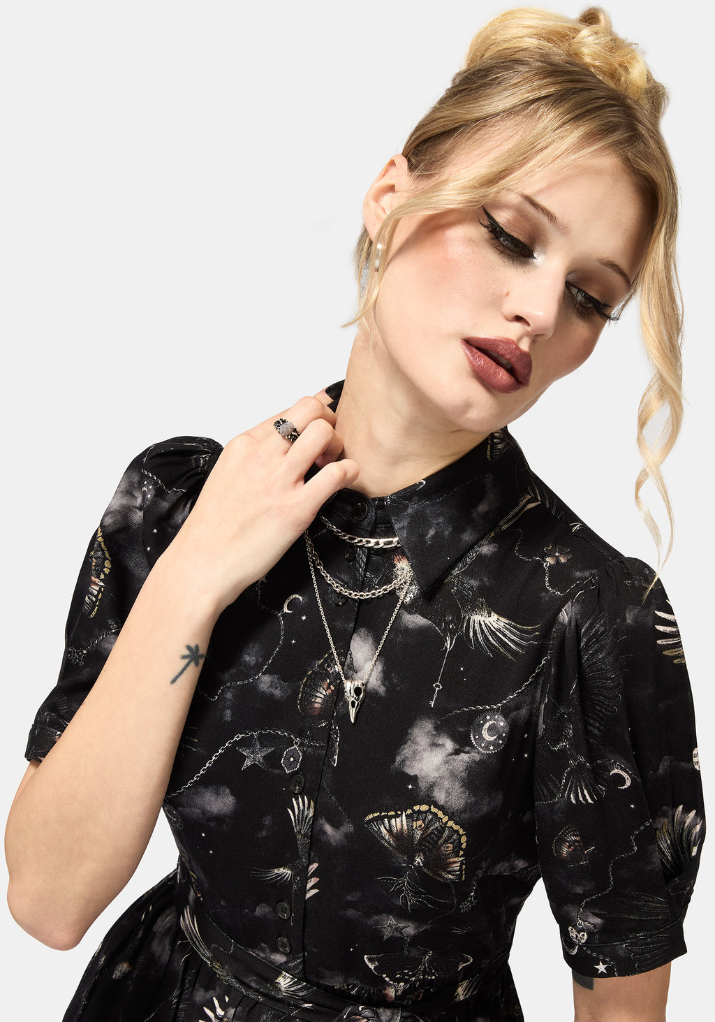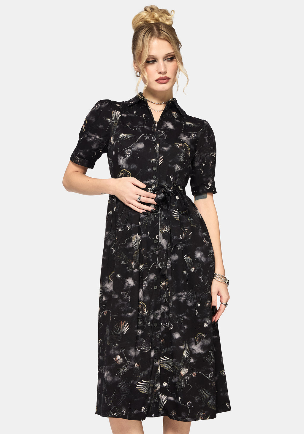 • Black Moth Print Midi Shirt Dress