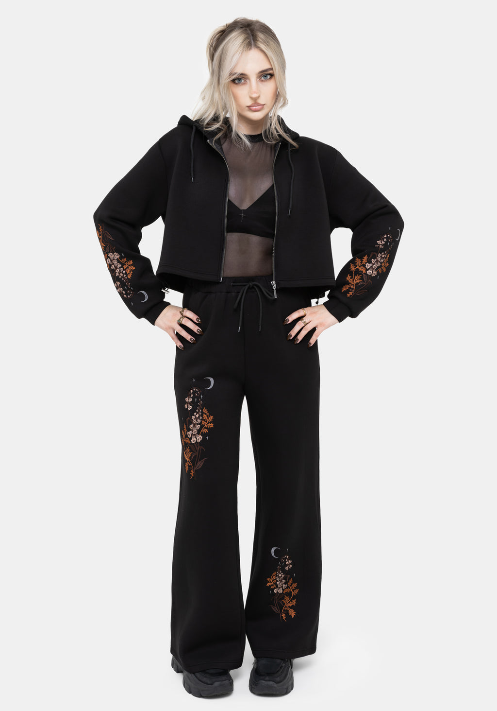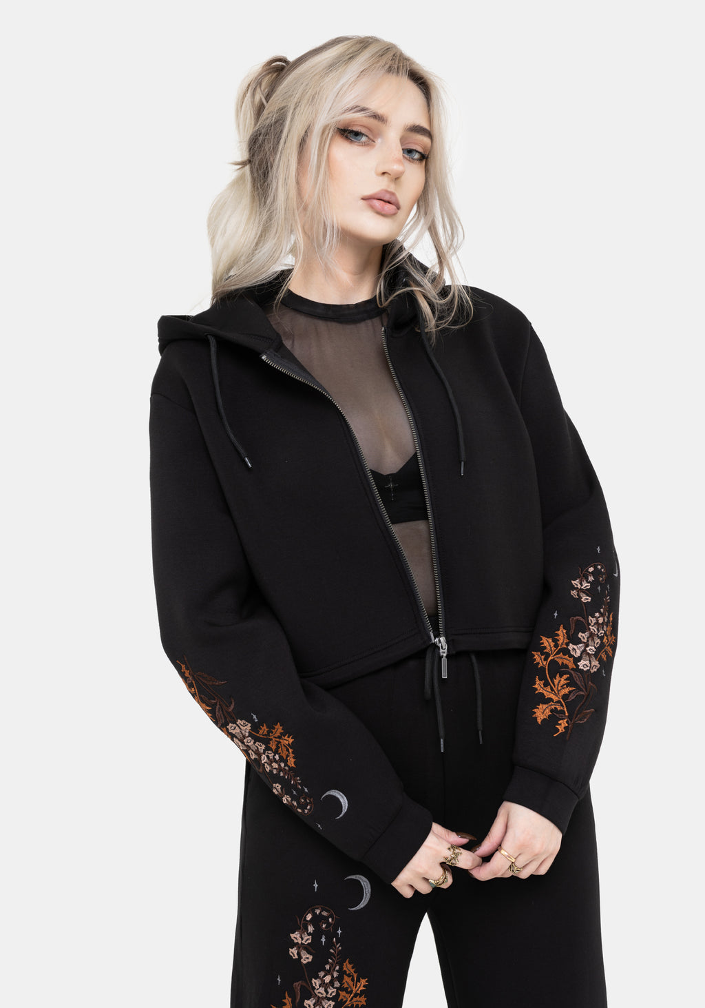 • Black Embroidered Cropped Hoodie