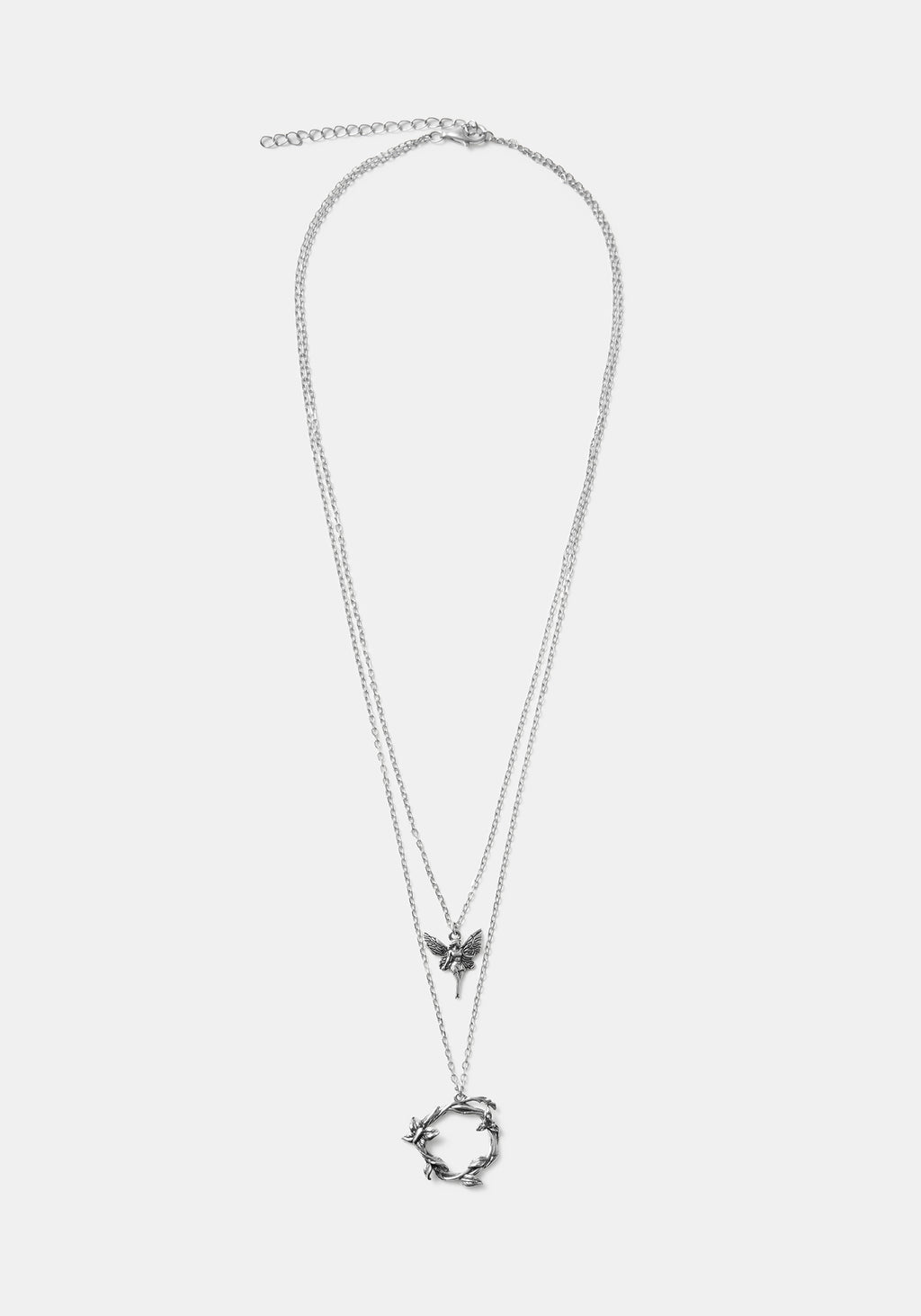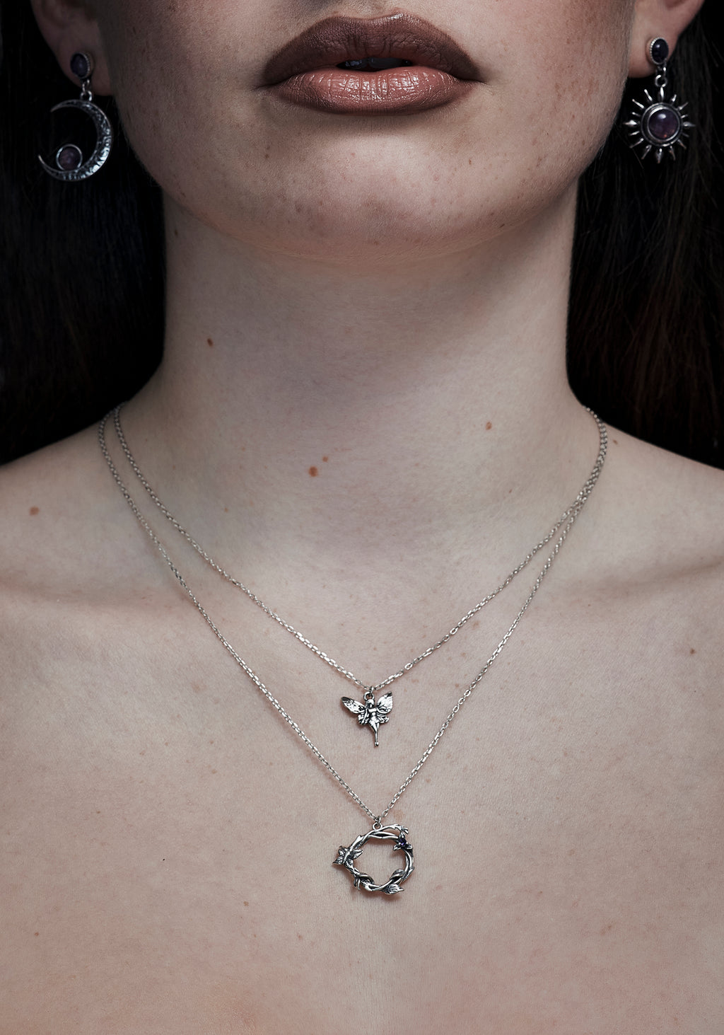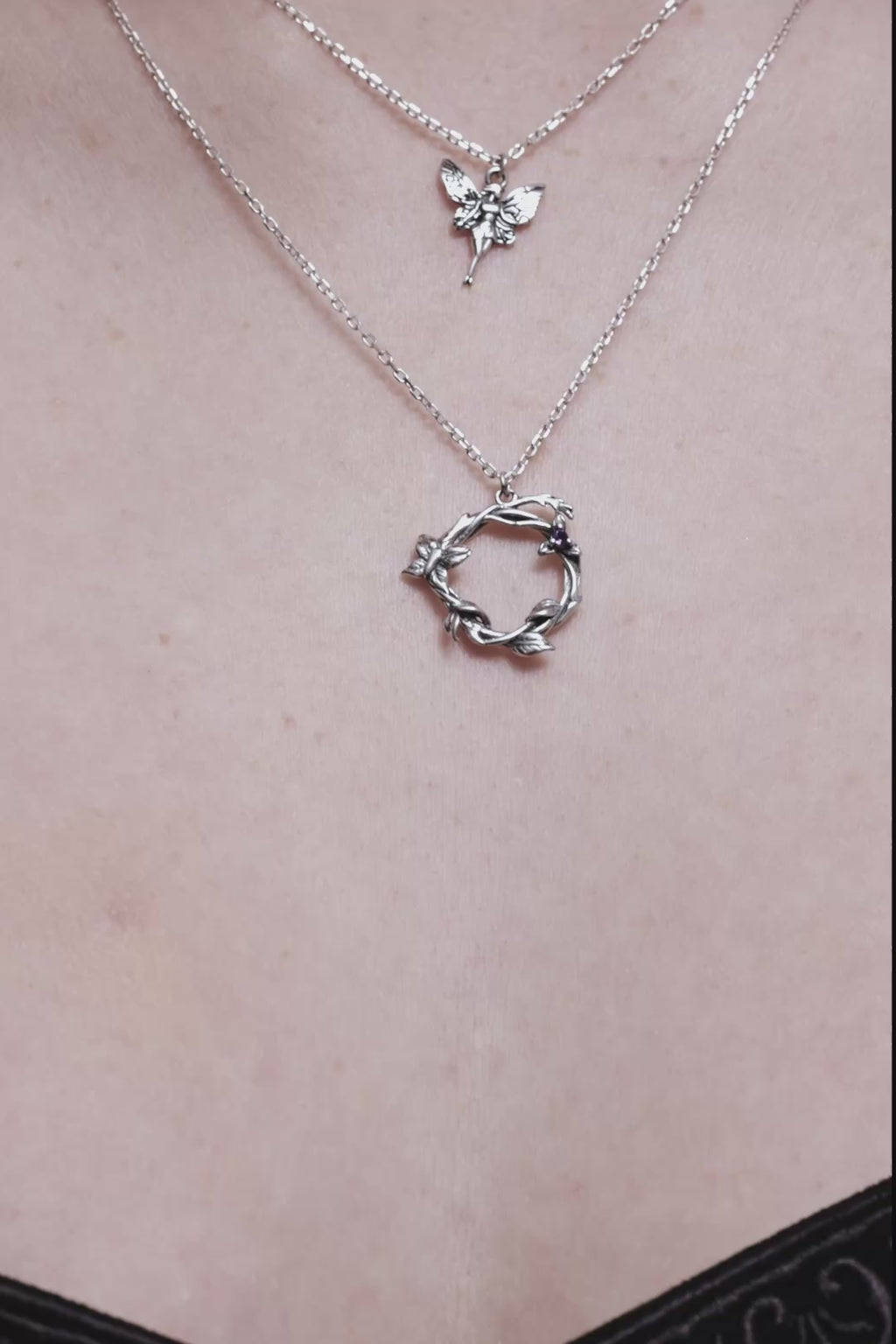 Where twilight fae guard their violet secrets… the Forevermore collection unveils a sterling silver necklace that entwines gothic elegance with woodland magic. Featuring a Maypole silver fairy pendant set within a vine wreath adorned with amethyst, leaves, and butterfly details, this double-layered chain piece evokes mystery, enchantment, and timeless beauty.